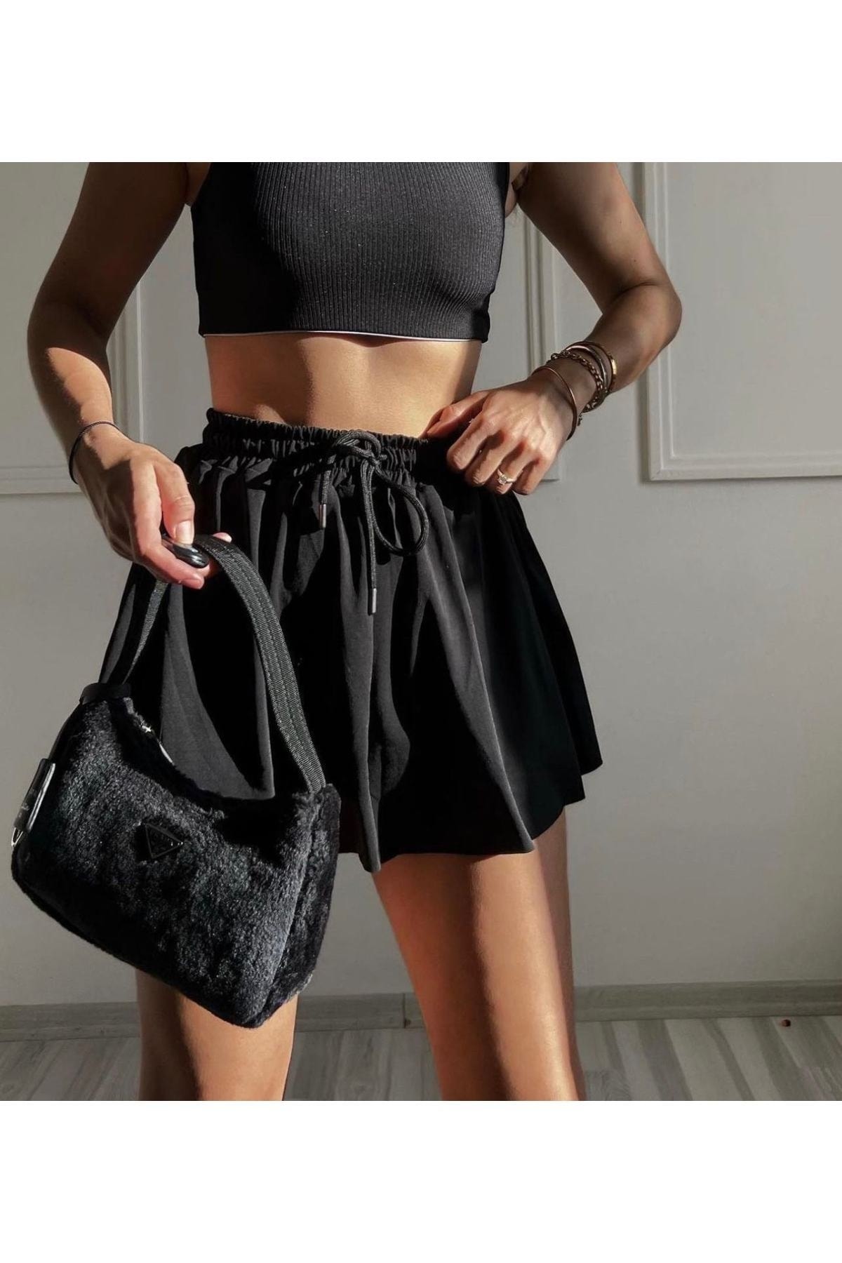 Tasarım Detayları: İç kısımda hareketlerinizi kısıtlamayan ve frikik derdini ortadan kaldıran esnek şort; dış kısımda ise yanlardan yırtmaçlı, dökümlü ve havalı bir etek görünümü.