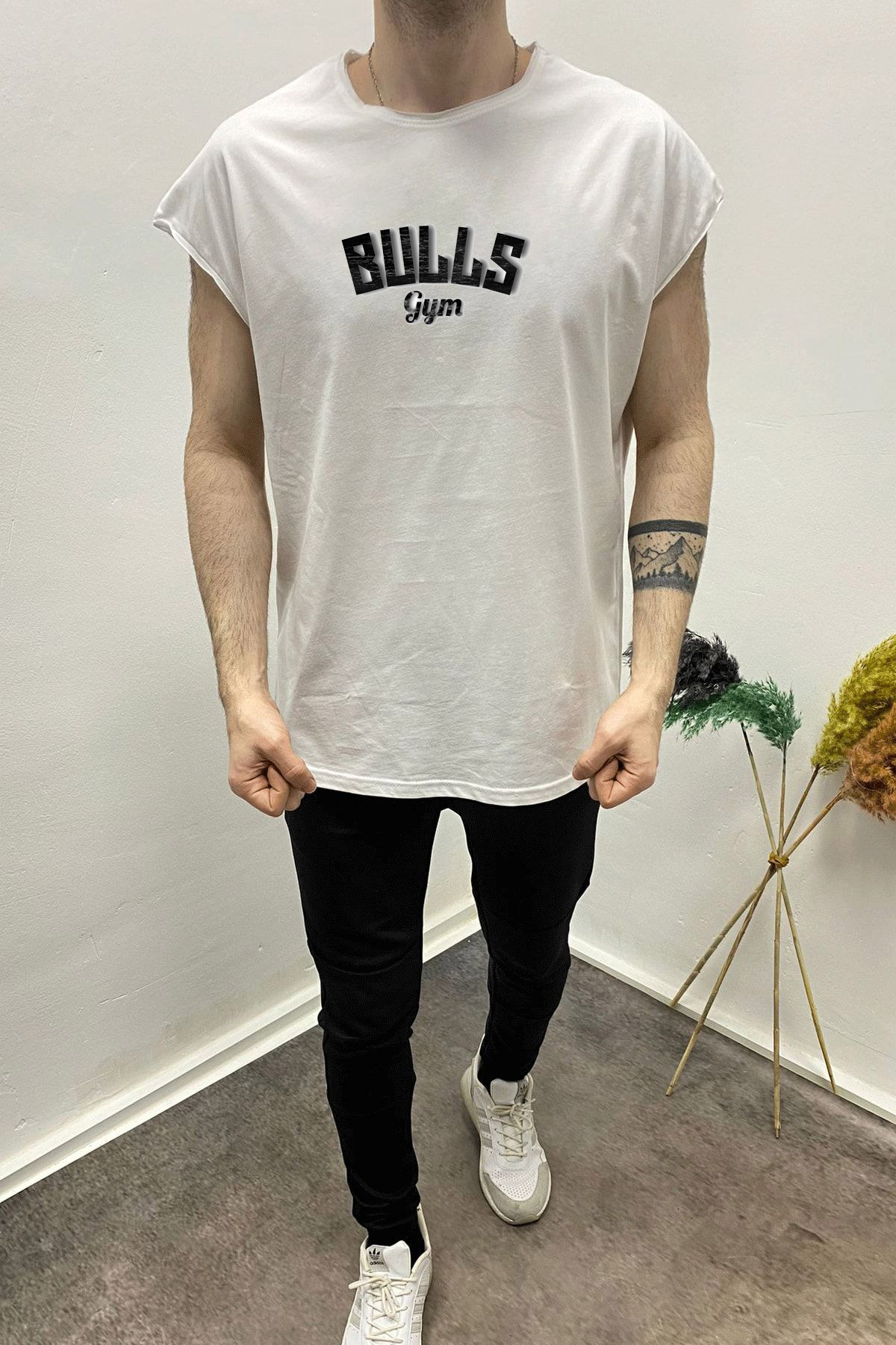 Erkek Beyaz Oversize Sıfır Kol Tişört – “Bulls” Baskılı Sokak Stili T-shirt