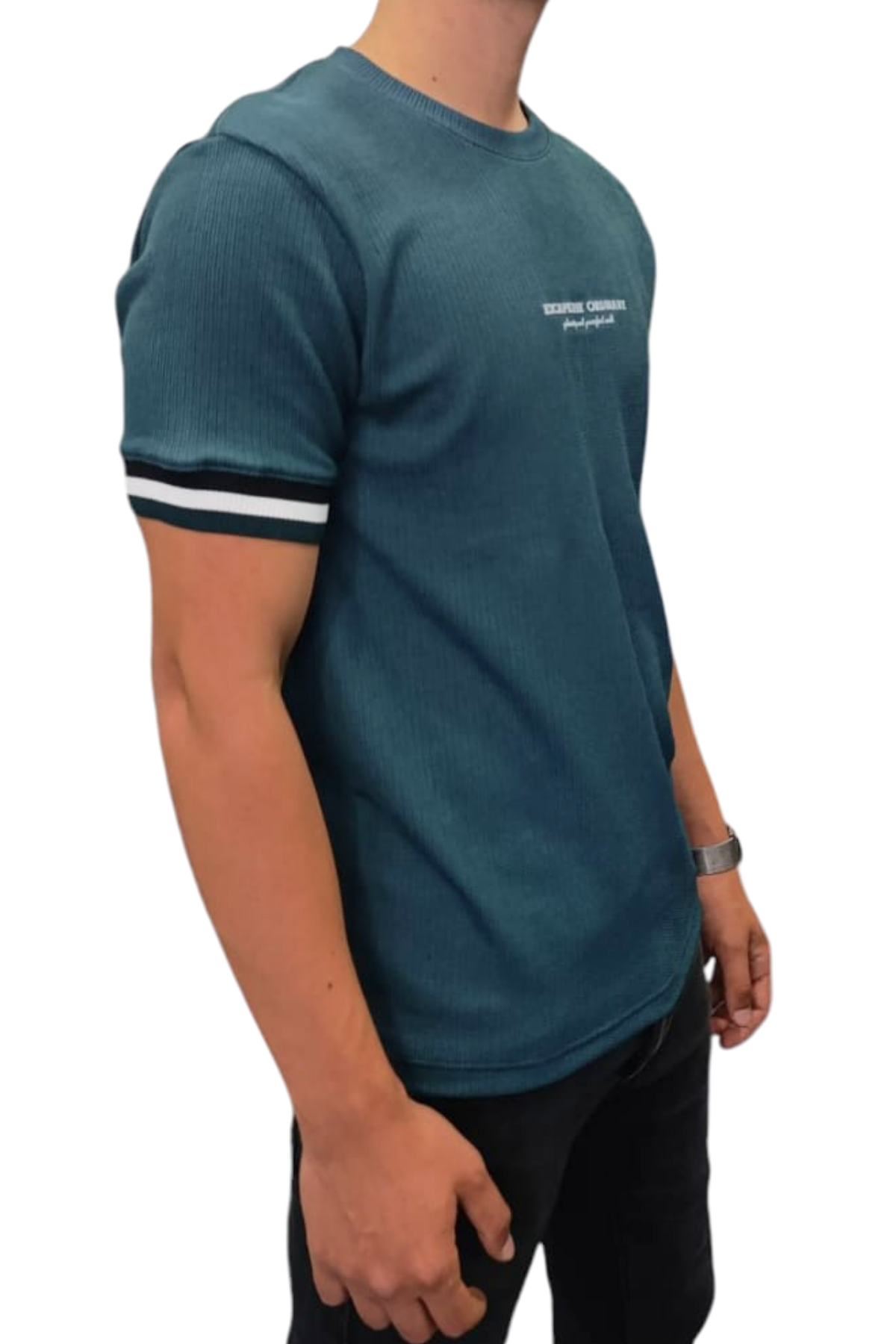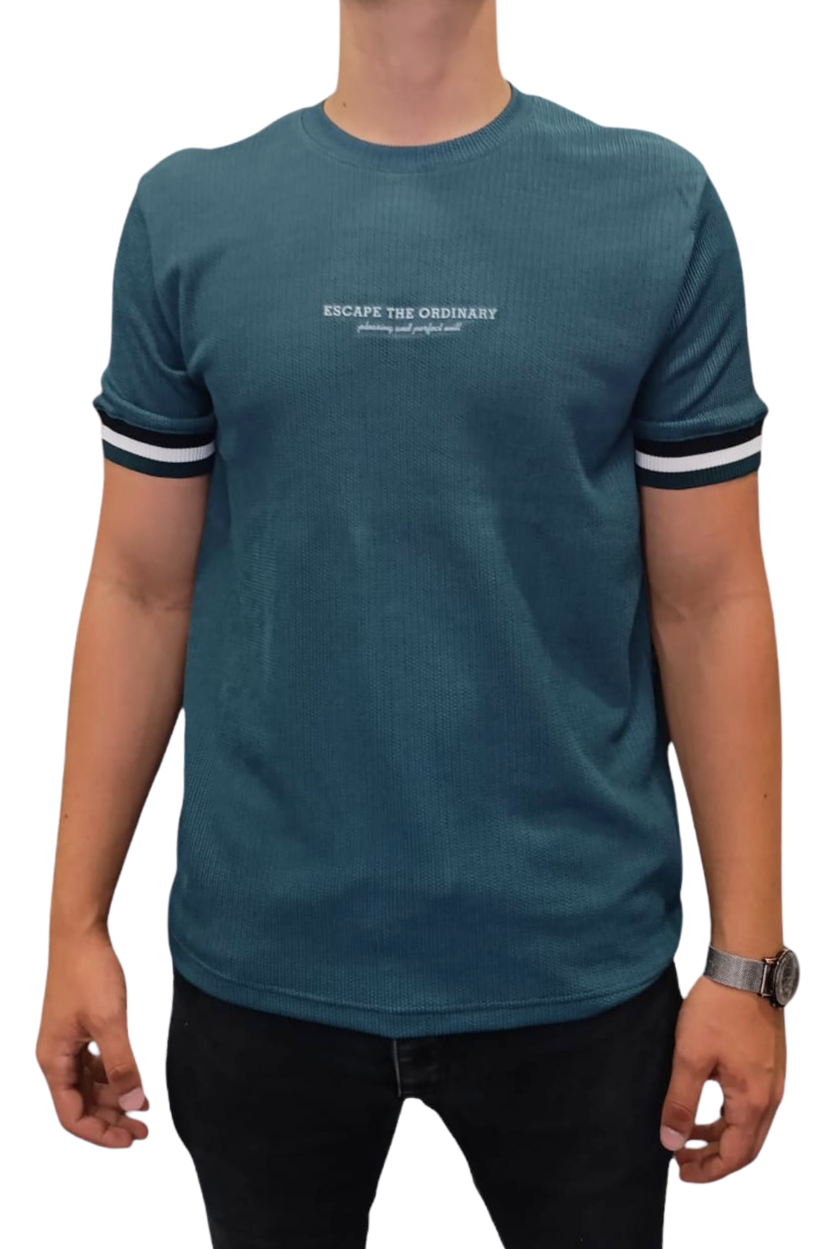 Escape to Ordinary Baskılı Ottoman Jakarlı Oversize Tişört – Petrol Mavisi