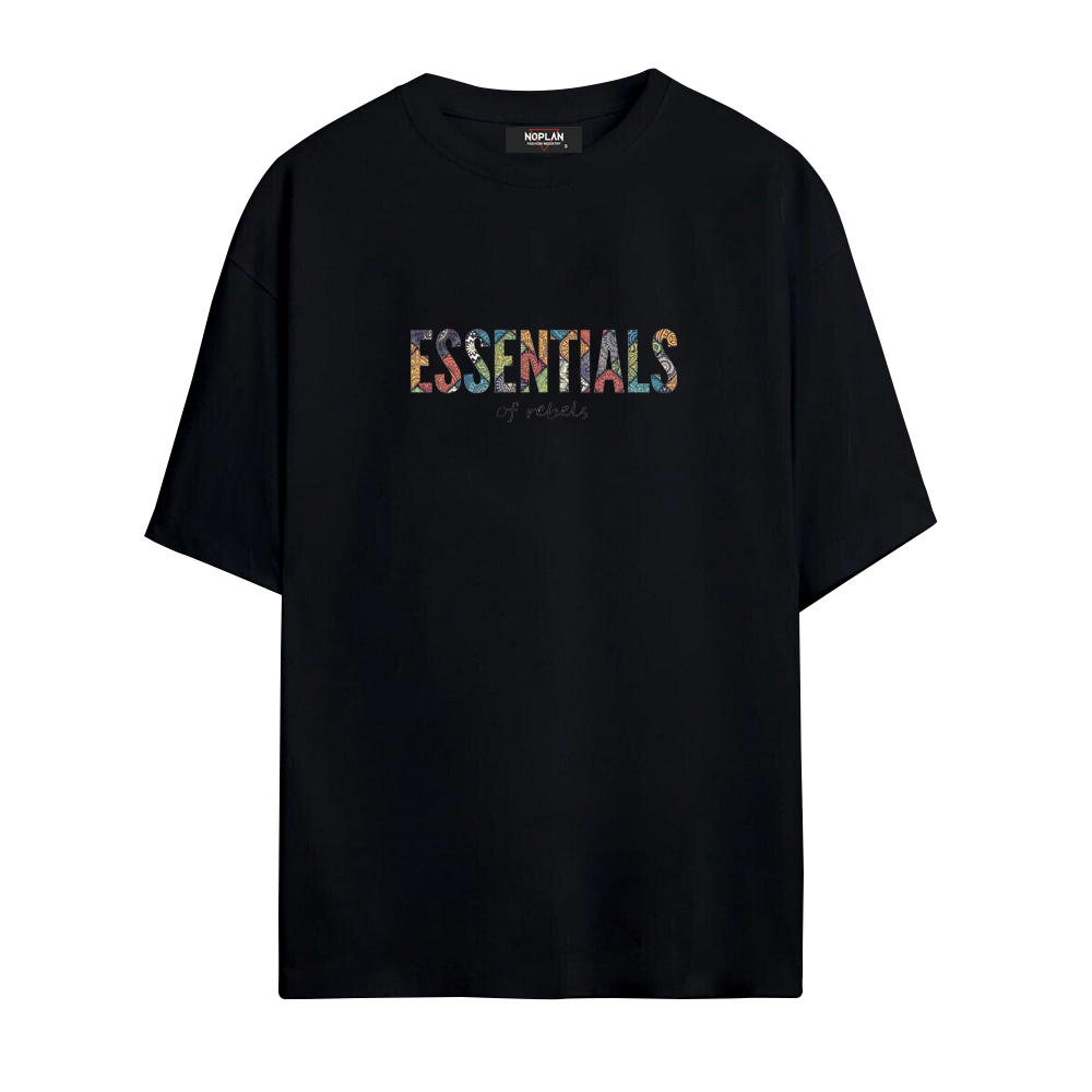 Tasarım Detayları: Klasik ve rahat bisiklet yaka; göğüs kısmında her harfi farklı, canlı etnik/mandala desenleriyle doldurulmuş dikkat çekici “ESSENTIALS” tipografisi ve hemen altında zarif bir el yazısı fontuyla yazılmış “of rebels” detayı.