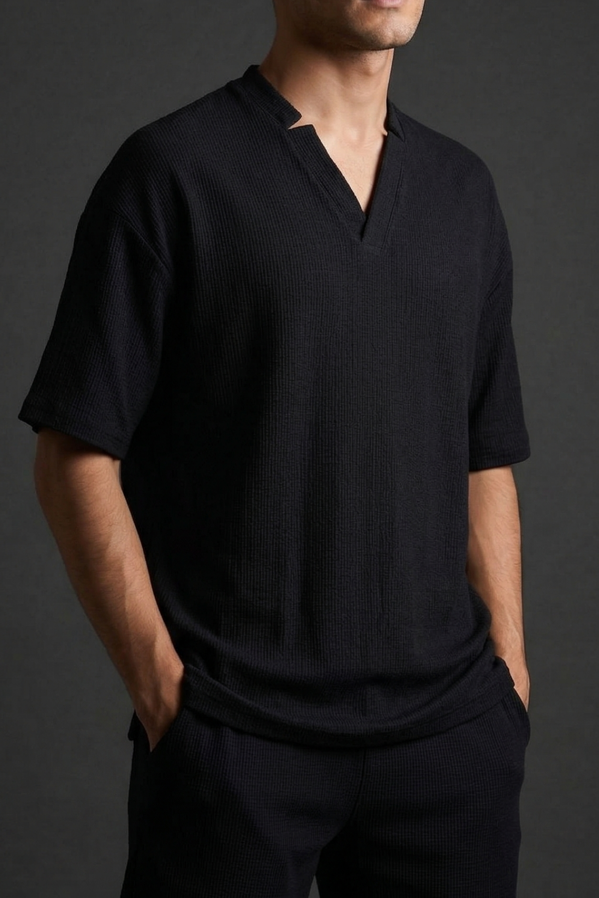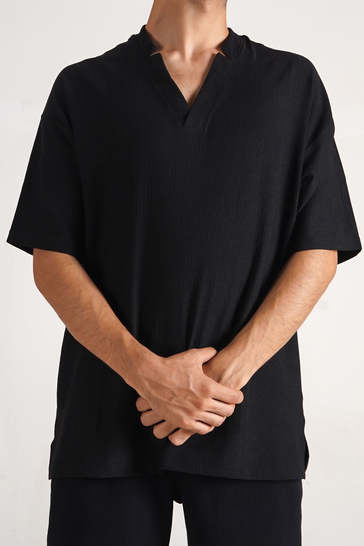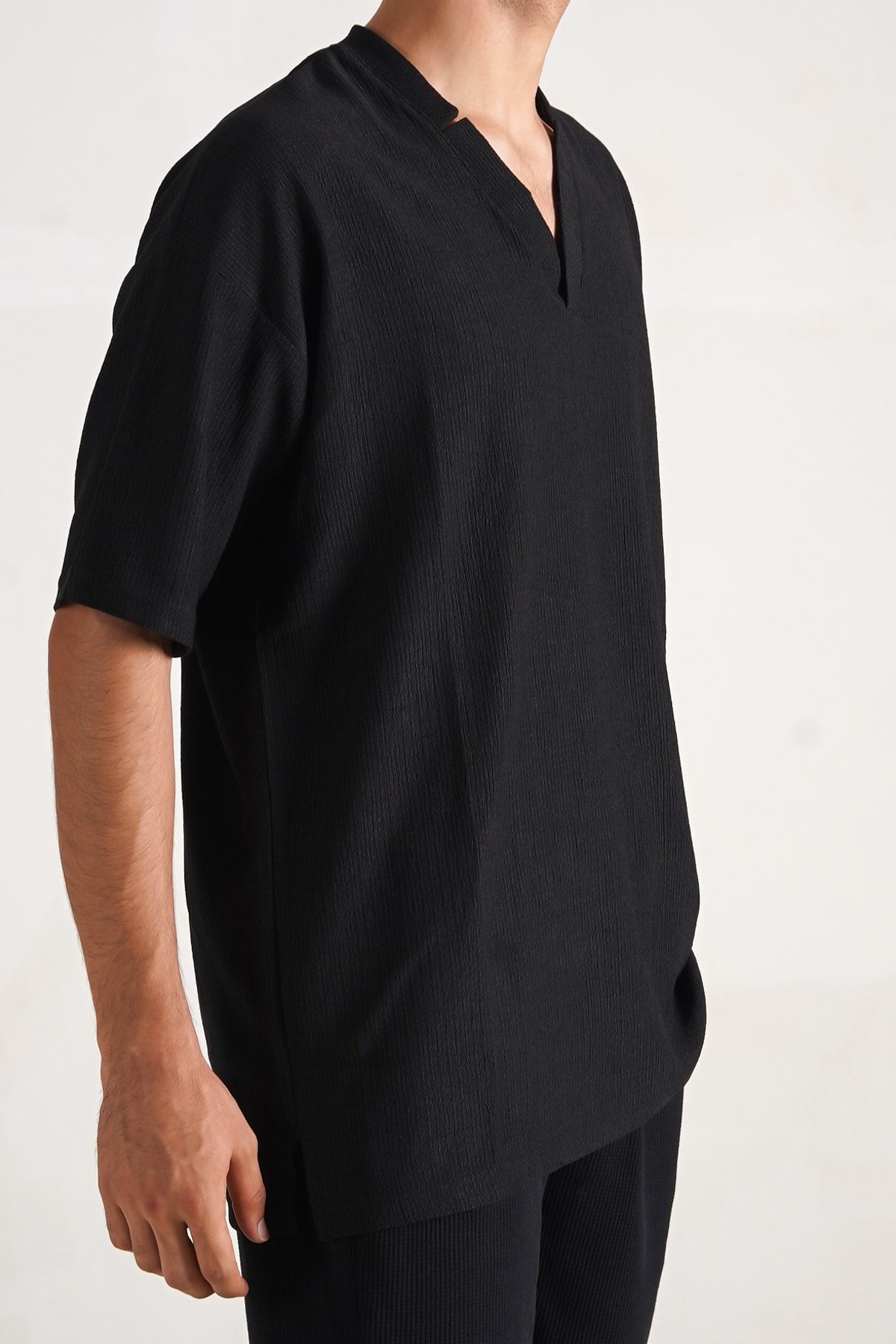 Siyahın vazgeçilmez asaletini yaz aylarının ferahlığıyla buluşturmaya ne dersiniz? Geleneksel tişört kalıplarının dışına çıkan bu Hakim V Yaka Oversize Tişört, kendinden dokulu (kırışık/bürümcük) özel kumaşıyla hem benzersiz bir hafiflik hem de bohem bir karakter sunuyor.