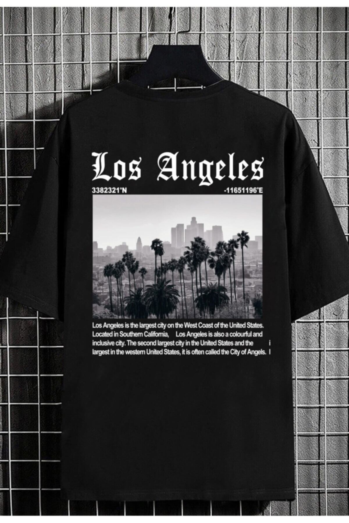 Tasarım Detayları: Sırtta odak noktası olan; gotik (Old English) fontla yazılmış iddialı “Los Angeles” yazısı, coğrafi koordinat detayları, palmiyeler ve gökdelenlerden oluşan nostaljik siyah-beyaz fotoğraf baskısı ve şehri anlatan İngilizce alt metin. Rahat kullanım sunan klasik bisiklet yaka.